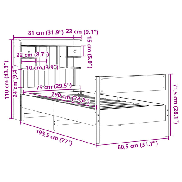 Sänky kirjahyllyllä ilman patjaa 75x190cm mänty