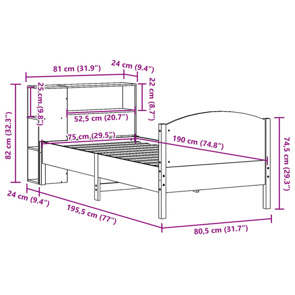 Vahanruskea sänky/kirjahylly ilman patjaa 75x190cm mänty