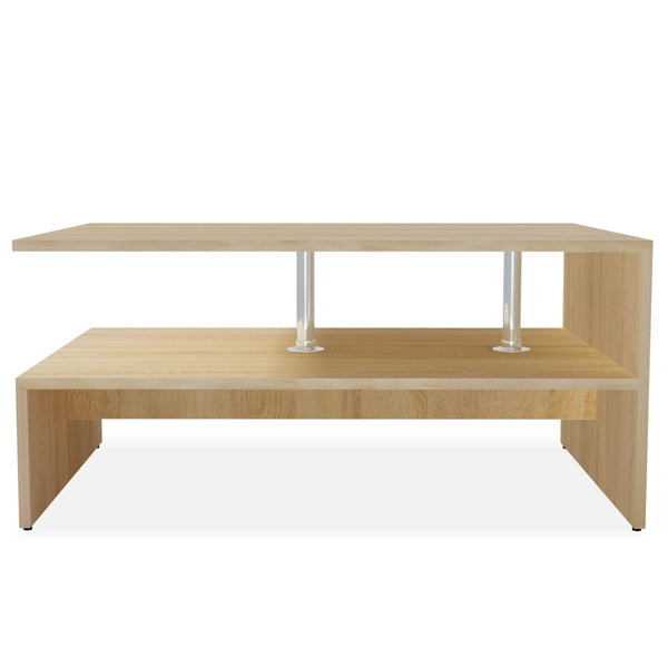 Sohvapöytä on valmistettu teknisestä puusta, jossa on PVC reunat, se on vakaa ja kestävä. Tässä sivupöydässä on kaksi hyllyä, jotka on liitetty yhdeltä sivulta ja niiden tukena on terästolpat, jotka lisäävät modernia tunnelmaa. Ylä- ja alahyllyn välissä on suuri tila, joka tekee tästä päätypöydästä todella käytännöllisen kirjojen, dokumenttien ja muiden tarvikkeiden säilyttämiseen.