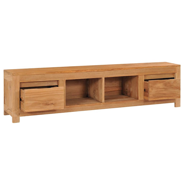 Rustiikkinen TV-taso on valmistettu täydestä tiikistä, joten se tarjoaa vankan ja kestävän jalustan. Luonnollinen öljyviimeistely pitää pinnan sileänä, jolloin se on helppohoitoinen eikä naarmuunnu herkästi. Tasossa on kaksi tilavaa vetolaatikkoa erilaisille tavaroille sekä kaksi avointa osastoa multimedialaitteille, pelikonsoleille, CD-levyille, aikakauslehdille jne.