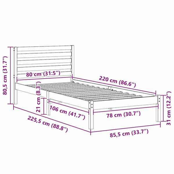Vahanruskea sängyn runko päätyllä 80x220cm mänty