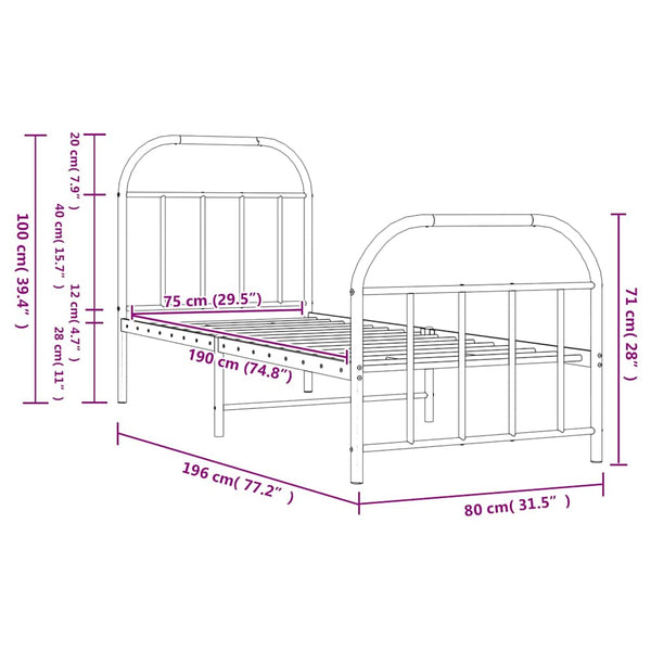 Musta metallinen sängynrunko päädyillä 75x190cm