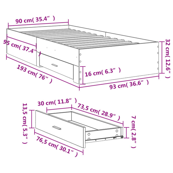 Betoninharmaa sängynrunko laatikoilla 90x190cm puinen