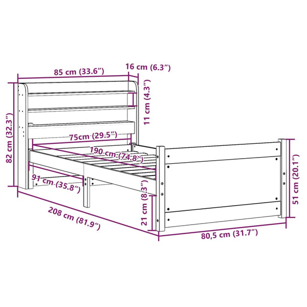 Sängynrunko päädyllä 75x190cm mänty