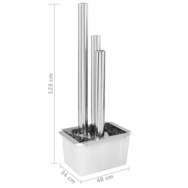 Kiiltävästä 304 ruostumattomasta teräksestä valmistetussa puutarhan suihkulähteessämme on kolme sylinteriä, LED-valo ja pumppu. Se muuttaa puutarhasi tai terassisi paikaksi, jossa voit rentouttaa silmiäsi ja korviasi.