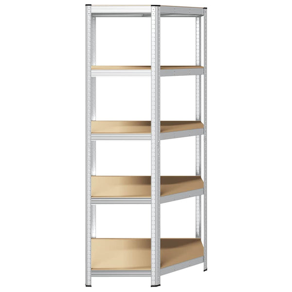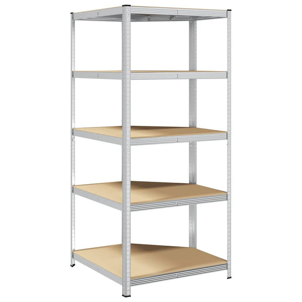 5-tasoinen Varastokulmahylly hopea teräs ja tekninen puu