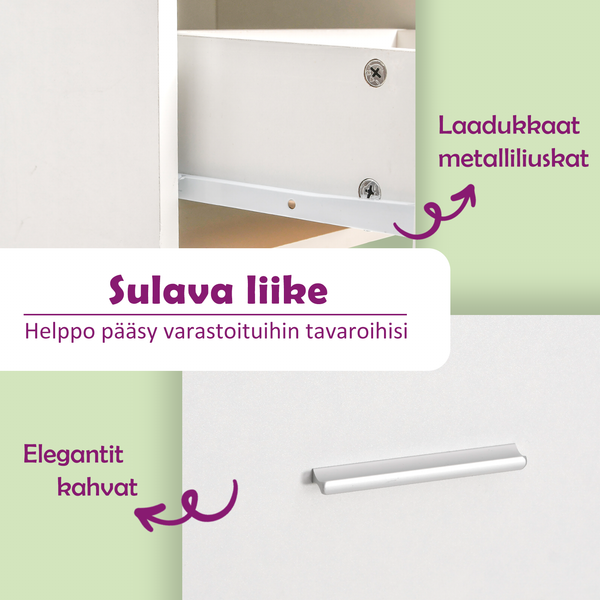 - Säilytystila: Sohvapöytä on varustettu laatikolla ja lokerolla, jotka tarjoavat säilytystilaa pikkutavaroiden, aikakauslehtien, kirjojen, DVD-levyjen ja multimedialaitteiden hyvässä järjestyksessä pitämiseen.