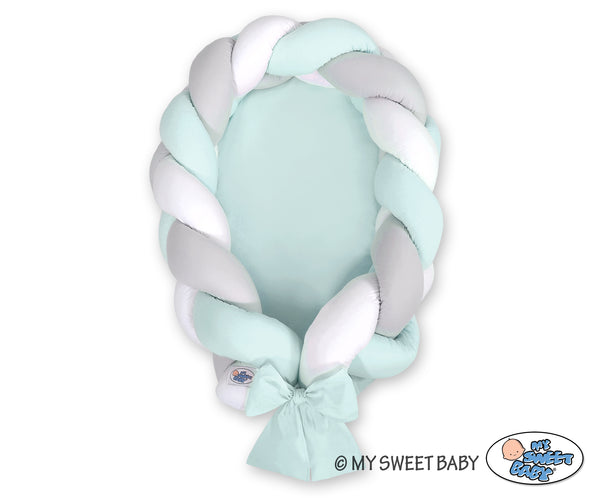 Monikäyttöinen punottu vauvan pesä, joka muuntuu myös pinnasängyn puskuriksi. Vauvan pesä on loistava ratkaisu jo ensimmäisiltä kuukausilta lähtien. Se on täydellinen paikka nukkua vauvallesi - pesä on pienempi ja viihtyisämpi kuin pinnasänky, joten vauva tuntee olonsa paljon turvallisemmaksi siellä. Irrottamalla punoksen patjasta se muuttuu punotuksi puskuriksi pinnasänkyyn (pituudeltaan jopa 180 cm). Punottu puskuri toimii loistavasti sekä vauvan sängyssä että "aikuisten" sängyssä. Se on myös alkuperäinen koristeellinen elementti lastenhuoneessa. Punottu puskuri kiinnitetään patjaan erityisillä puuvillanauhoilla, mikä mahdollistaa pesän helpottamisen ja vauvan asettamisen siihen. Vauvan pesän pohjana toimiva patjamatto voidaan irrottaa, joten itse tyynyliinan peseminen on helppoa. Patjamaton sisus on valmistettu modernista allergiatestatusta raaka-aineesta - puristetusta silikonittomasta kuitukankaasta, joka tarjoaa parhaan jäykkyyden, joustavuuden ja pehmeyden. Puskurin täyte koostuu pehmeästä ja hengittävästä Eco-Fillballista. Ne ovat ohuita pehmeitä kuituja, jotka on muotoiltu pieniksi palloiksi lisäventilaatioaukoilla. Koko: Patja L 66/75 cm, L 32/43 cm. Solmupuskuri: L 180 cm, K 20 cm.