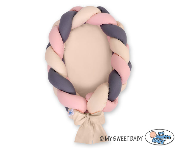 Monikäyttöinen punottu vauvan pesäkolo, joka muuntuu helposti pinnasängyn reunasuojaksi. Vauvan pesäkolo on loistava ratkaisu jo ensimmäisistä kuukausista lähtien. Se on täydellinen paikka nukkua vauvallesi - pesäkolo on pienempi ja kodikkaampi kuin pinnasänky, joten vauva tuntee olonsa paljon turvallisemmaksi siinä. Irrottamalla punoksen patjasta se muuttuu punotuksi reunasuojaksi pinnasängylle (enintään 180 cm pitkälle). Punottu reunasuoja toimii hyvin sekä vauvansängyssä että "aikuisten" sängyssä. Se on myös alkuperäinen koristeellinen elementti lastenhuoneeseen. Punottu reunasuoja kiinnitetään patjaan erityisillä puuvillanauhoilla, mikä helpottaa pesän muotoilua ja vauvan asettamista siihen. Vauvan pesän pohjana toimiva patjamatto on irrotettava, joten itse tyynyliinan peseminen on helppoa. Patjamaton sisus on valmistettu modernista allergiatestatusta raaka-aineesta - puristetusta silikonista valmistetusta huokoisesta kuitukankaasta, joka tarjoaa parhaan jäykkyyden, joustavuuden ja pehmeyden. Reunasuojan täyte koostuu pehmeästä ja hengittävästä Eco-Fillballista. Ne ovat ohuita pehmeitä kuituja, jotka on muotoiltu pieniksi palloiksi ja joissa on lisäksi ilmastointikanavia. Koko: Patja L 66/75 cm, L 32/43 cm, Punosreunasuoja: L 180 cm, K 20 cm.