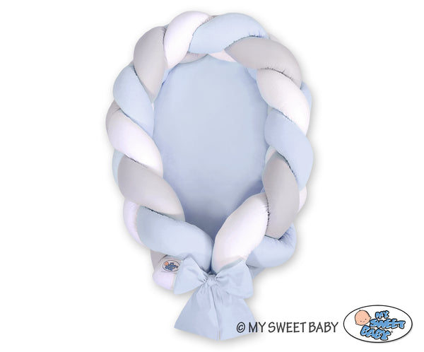 Monitoiminen punottu vauvan pesäkehto, joka voidaan muuttaa puskuriksi vauvan sänkyyn. Vauvan pesäkehto on loistava ratkaisu ensimmäisistä kuukausista lähtien. Se on täydellinen paikka nukkua vauvallesi - pesäkehto on pienempi ja viihtyisämpi kuin vauvan sänky, joten vauva tuntee olonsa paljon turvallisemmaksi siellä. Irrottamalla punoksen patjasta siitä tulee punottu puskuri vauvan sänkyyn (pituudeltaan jopa 180 cm). Punottu puskuri toimii hyvin sekä vauvasängyssä että "aikuisten" sängyssä. Se on myös alkuperäinen koristeellinen elementti lastenhuoneessa. Punottu puskuri kiinnitetään patjaan erityisillä puuvillanauhoilla, mikä helpottaa pesäkkeen muodostamista ja vauvan sijoittamista siihen. Vauvan pesäkkeen pohjana toimiva matto on irrotettava, mikä helpottaa itse tyynyliinan pesemistä. Maton sisus on valmistettu modernista antiallergisesta sertifioidusta raaka-aineesta - puristetusta silikonittomasta kuidusta, joka tarjoaa parhaan jäykkyyden, joustavuuden ja pehmeyden. Puskurin täyte koostuu pehmeästä ja hengittävästä Eco-Fillball-kuidusta. Ne ovat ohuita pehmeitä kuituja, jotka on muotoiltu pieniksi palloiksi lisäventilaatiokanavilla. Koko: Matto L 66/75 cm, L 32/43 cm. Solmupuskuri: L 180 cm, K 20 cm.