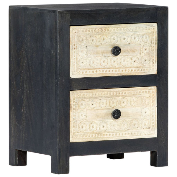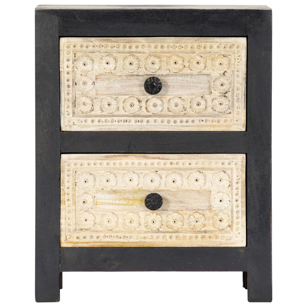Täydestä mangopuusta valmistettu yöpöytä on kauniisti viimeistelty kiillottamalla, maalaamalla ja lakkaamalla, mikä antaa sille hienostuneen ilmeen. Lisäksi kaksi laatikkoa käsin kaiverretuin kuvioin lisäävät yöpöydän kauneutta ja tarjoavat samalla runsaasti säilytystilaa pienten esineiden pitämiseksi järjestyksessä ja käden ulottuvilla. Yöpöytä on helppo koota ja puhdistaa kostealla liinalla.