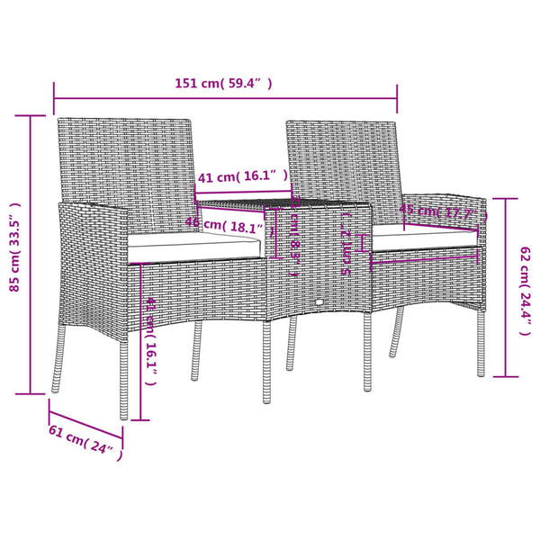 Antrasiitti puutarhasohva ja sivupöytä 2-istuttava, polyrottinki