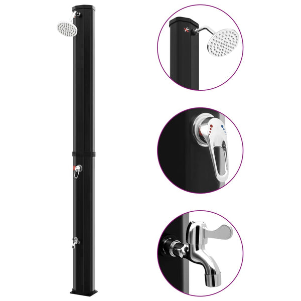 Musta aurinkolämmitteinen ulkosuihku, suihkupää ja hana 35 l