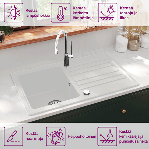Koska se on valmistettu laadukkaasta graniitista niin tämä keittiön pesuallas on naarmuuntumaton ja iskunkestävä. Se ei likaannu tai tahraannu helposti. Tämä keittiön pesuallas kestää 280 °C lämpöä.