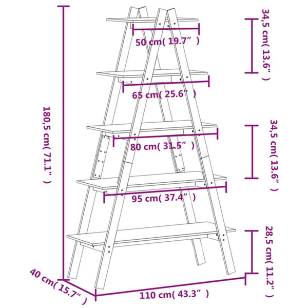 Täysi tammi hylly 5 kerrosta a-muoto 110x40x180,5cm