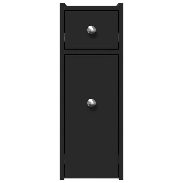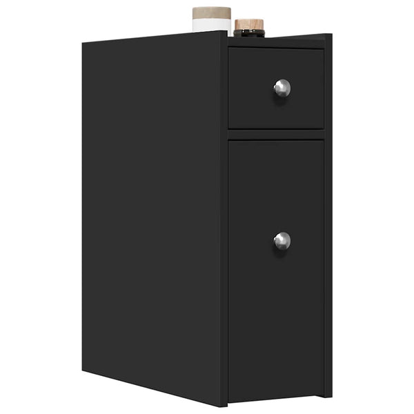Musta kapea kylpyhuonekaappi pyörillä puinen