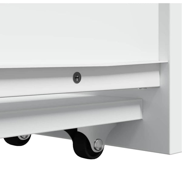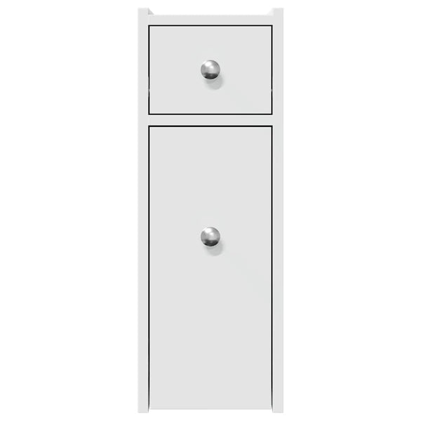 Valkoinen kapea kylpyhuonekaappi pyörillä puinen