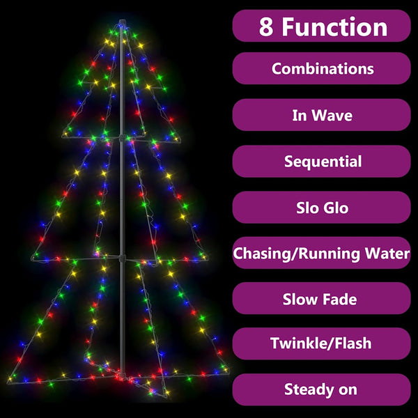 Valot koostuvat 200 LED-valosta, jotka ovat energiatehokkaita ja loistavat kirkkaana. Niissä on kahdeksan erilaista valoefektiä: kaikkien efektien yhdistelmä, hidas hehku, välke/vilkkuva, aalto, juokseva vesi, peräkkäinen, tasaisesti päällä ja hidas himmennys. Se valaisee kauniisti ja luo maagista juhlatunnelmaa. Se on varsinainen katseenvangitsija erityisesti iltaisin, jolloin se toimii myös mukavana taustavalona. Itsestään seisova kartionmallinen joulukuusi voidaan helposti ja turvallisesti kiinnittää maahan mukana tulevilla kiinnitystarvikkeilla.
