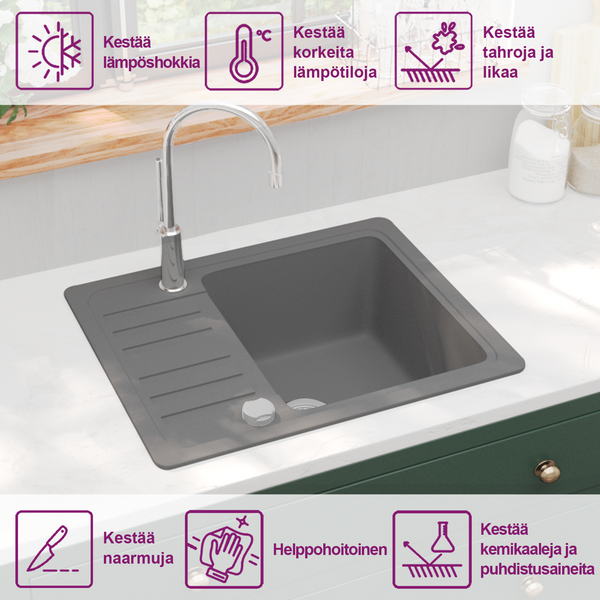Graniittinen tiskialtaamme on ajaton lisä keittiösi sisustukseen. Siinä on yksi, erityisen syvä allas ja tyylikäs muotoilu.