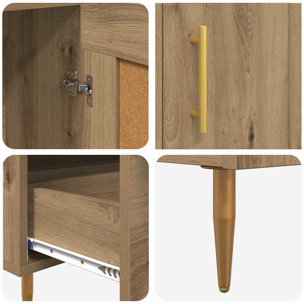 - Komponentit: Kaappi sisältää metalliset, kartiomaiset jalat, jotka antavat siihen eleganssia kultaisella viimeistelyllä. Nämä elementit tekevät siitä kestävän ja vakaan, samalla kun tankokahvat helpottavat pääsyä kaapin sisältöön. Laatuhyllyt tarjoavat runsaasti tilaa eri esineiden järjestämiseen.