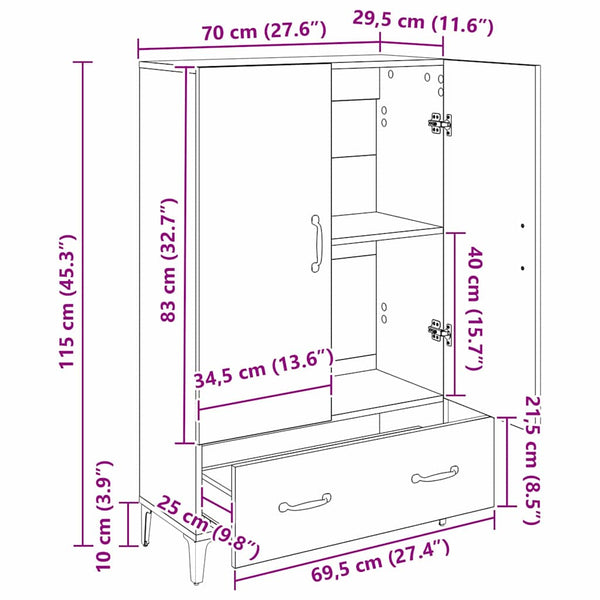 - Käytännölliset ominaisuudet: Korkeakaapin saranaluukut mahdollistavat helpon pääsyn sisällöihin, ja kaarivetimet ovat mukavat käyttää, yhdistäen toimivuuden ja tyylin. Se on tarkoitettu vain sisätiloihin, säilyttäen tyylinsä ja käytännöllisyytensä hallitussa ympäristössä.