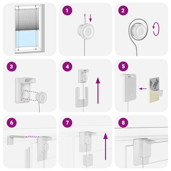 • Kaksi asennustapaa: Voit kiinnittää laskostetun kaihtimen seinään tai ikkunaan ruuveilla tai ilman porausta kiinnityskannattimilla tarpeen mukaan.
