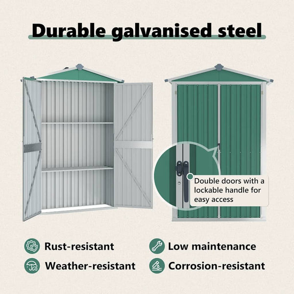 Tämä varastorakennus on varustettu tuuletusaukoilla, jotka tarjoavat ilmanvaihtoa, joka vähentää kosteuden ja hajujen muodostumista vajaan. Hyllyillään se tarjoaa reilusti säilytystilaa tärkeiden tavaroidesi järjestyksessä pitämiseen. Tämä vain vähäistä huoltoa tarvitseva erittäin kestävä ulkovarasto on valmistettu galvanoidusta teräksestä. Vajan kaksi ovea edessä helpottavat sisään- ja uloskäyntiä. Kaltevan kattorakenteen ansiosta sadevesi valuu katolta pois itsekseen.