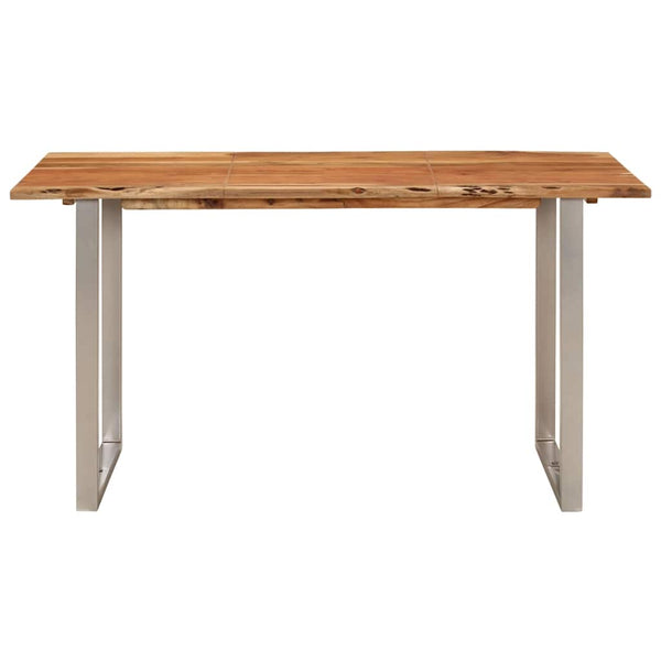 Tämä ruokapöytä on valmistettu täydestä akaasiapuusta, trooppisesta kovapuusta, joka on kuuluisa vankkuudestaan ja rikkaista pintakuvioistaan. Pöytätason eläväinen muoto ja reunat ovat tarkoituksellisesti käsiteltyjä, jotta puun alkuperäinen luonne ja luonnollinen vaikutelma saadaan sisustukseen! Jokainen valmistusprosessin vaihe suoritetaan erittäin huolellisesti, olipa kyse sitten kiillotuksesta, maalaamisesta tai lakkaamisesta. Teräsjalat täydentävät teollista ilmettä ja tukevat pöydän rakennetta.