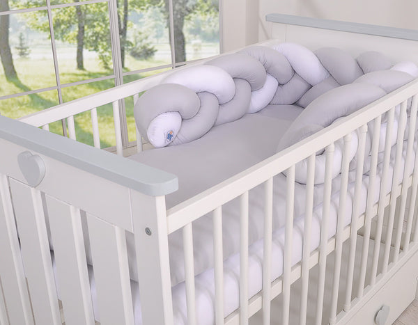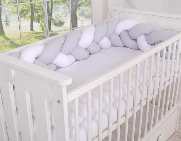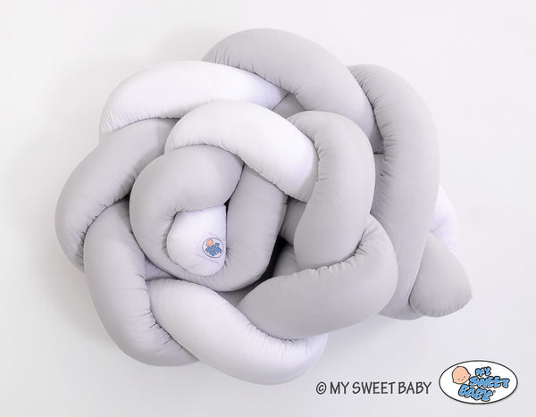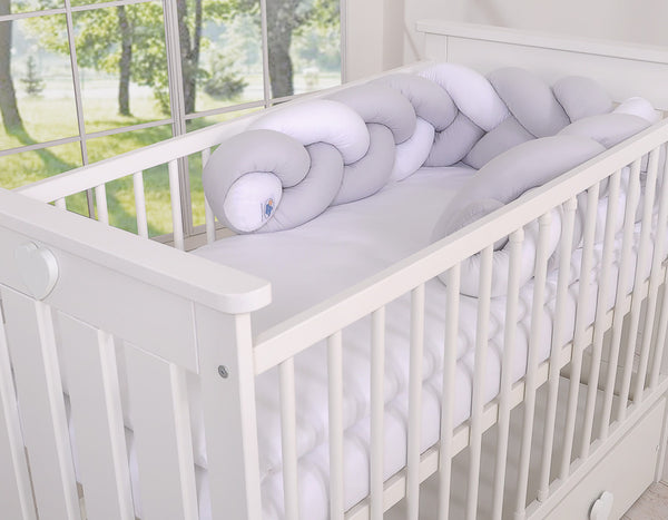 Tervetuloa tutustumaan valkois-harmaaseen Knot-bumperiin! Tämä kaunis ja erittäin pehmeä punottu pinnasängyn suojapehmuste on valmistettu laadukkaasta 100% puuvillasta. Sen avulla voit suojata vauvasi kädet, jalat, pään ja vartalon pinnasängyn teräviltä kulmilta ja kovilta seiniltä.