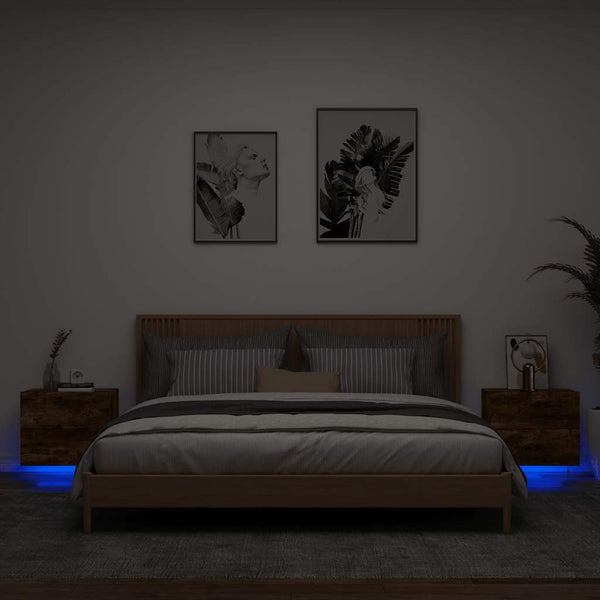 Seinäkiinnitettävät yöpöydät led-valoilla 2 kpl savutammi