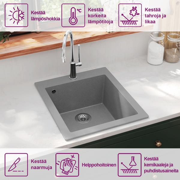 Korkealaatuisesta graniitista valmistettu tiskiallas on erittäin kestävä eikä se naarmuunnu tai mene lommolle. Se hylkii myös likaa ja tahroja ja on täten helppo pitää puhtaana. Tiskiallas kestää kuumuutta jopa 280 asteeseen asti.