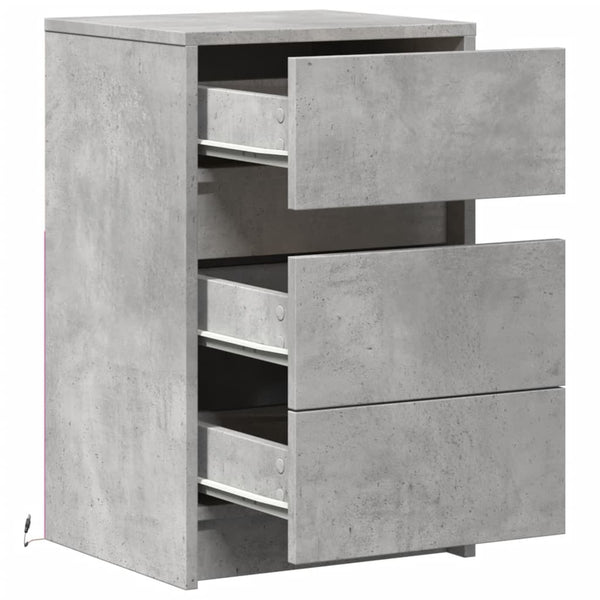 Betoninharmaa yöpöytä led-valoilla, puinen